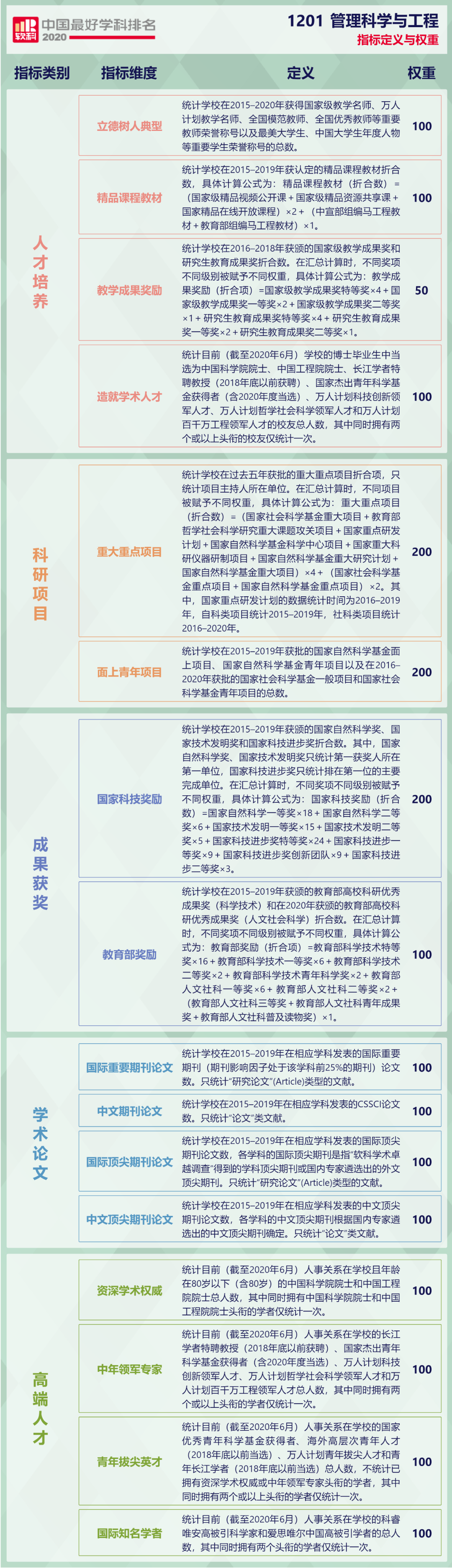中国最好学科排名的指标体系由人才培养、科研项目、成果获奖、学术论文、高端人才5个指标类别组成,下设16个指标维度,包括50余项测量指标。由于部分指标在不同学科门类的适用性和重要性存在差别,因此中国最好学科排名在不同学科采用差异化的指标体系。管理科学与工程学科的指标定义与权重如下: