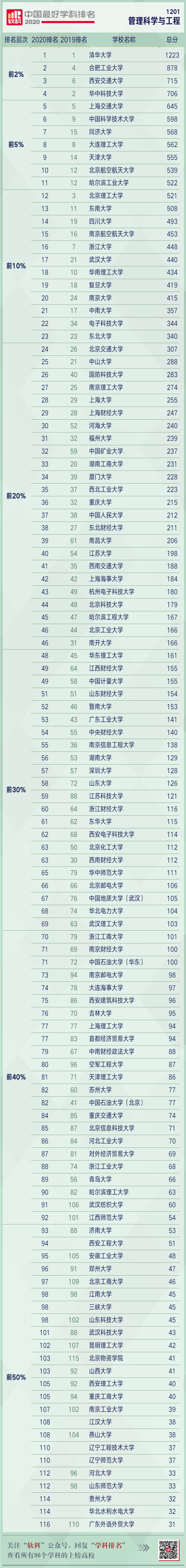 高等教育评价专业机构软科今日(10月15日)正式发布“2020软科中国最好学科排名”,排名榜单包括96个一级学科。管理科学与工程学科排名共有116所大学上榜,清华大学、合肥工业大学、西安交通大学、华中科技大学位列前2%。完整排名名单如下: