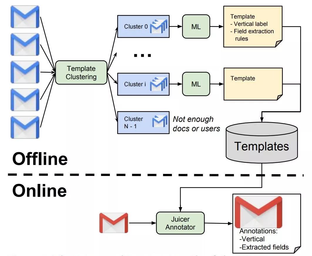 KDD2010的时候他们团队就有一篇推荐相关收信人的文章,方法非常简单、实用,而且很快该方法就迅速上线到系统,目前已经成为Gmail的标配。这次发表的文章是从Gmail的邮件内容中抽取结构化信息,例如个人相关的账单信息,飞机行程信息等。和传统的信息抽取不同,这里的抽取更关键的是要保证规模以及抽取中可能遇到的隐私问题。下图是整个抽取系统的架构图。