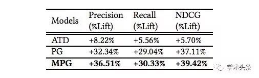 Lift in precision,recall,andnDCG for the ATD,PG,and MPG models at rank m=3 as compared to the baseline RCP model.