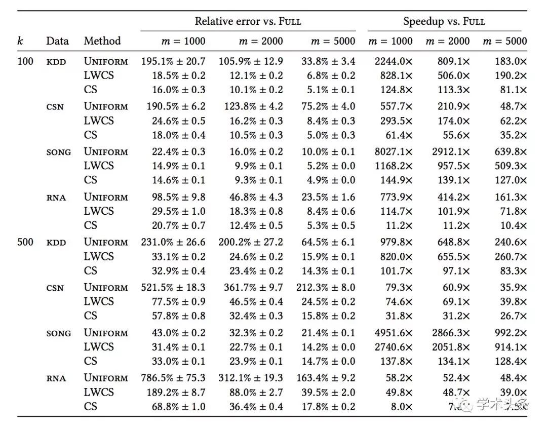 由于是个理论文章,所以文章的实验相对比较简单,对比了两种方法,一种是随机抽样(Uniform),还有一种是Lucic等人提出的经典算法CS。几个数据集还行,都相对比较小,看来作者真的不想做实验室。最后的结果也表明作者提出的方法LWCS可以把误差降低到16%,并且同时保持两个数量级的加速度。下表给出了在这几个数据集(KDD—KDD CUP2004里面的一个匹配蛋白质序列的竞赛、CSN—手机加速传感器的数据、Song—预测音乐的年份、RNA—预测RNA的序列对)上的实验结果。