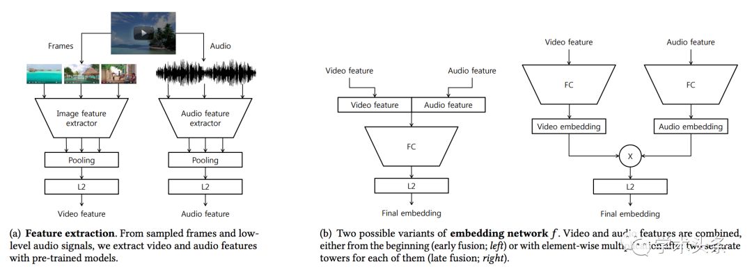 从方法论来看,这篇文章的方法其实很简单,首先对视频的内容进行表示学习,具体来说用的是Inception-v3 网络,另一方面对音频信息也进行表示学习,这里用了一个基于VGG的音频模型和ResNet-50的网络结构。学习的时候使用了排序的Triplet loss,也就是给定三个视频(Anchor、Positive、Negative),保证学习的时候Anchor视频和Positive更相似,和Negative更不相似(Negative可以随机选择一个)。学习的时候把刚才单独学习到的表示作为Triplet Loss function的输入,然后学习每个视频的混合表示(包括视频和音频)。混合策略可以有Early Fusion(右下图中的第一个混合策略),或者Late Fusion(右下图中的第一个混合策略)。