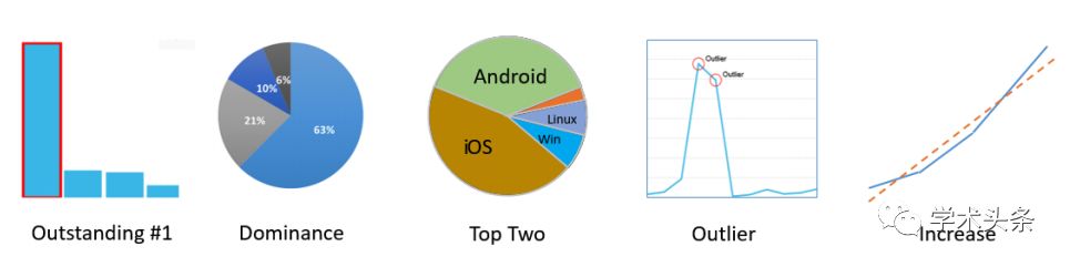 降维处理,见下图。第2个图则给出了BigIN4可能挖掘出来的Insights:包括Outstanding(就是某些数据模式和其他数据显著不同);Dominance(某个因素对数据分布起着绝对性作用);Top Two(某个维度的两个取值占了整个数据样本的大多数);Outlier(时间序列上的显著差异);Increase/Decrease(时间序列上的递增或者递减)。