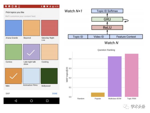 该文提出一个基于RNN的问题(话题)自动生成方法(第一阶段),也就是系统会根据用户兴趣自动生成话题,主动询问用户,然后在第二阶段根据用户反馈修正推荐结果,最后该方法在YouTube上进行了验证。基于深度学习的话题生成可以大大提高最终的推荐结果。图24给出了文章的主要思想和结果,其中左图是系统主动提问的界面;右上图是文章使用的基于RNN的话题自动生成模型(当然第二阶段还有一个混合模型);右下图是针对自动生成话题的评估结果。