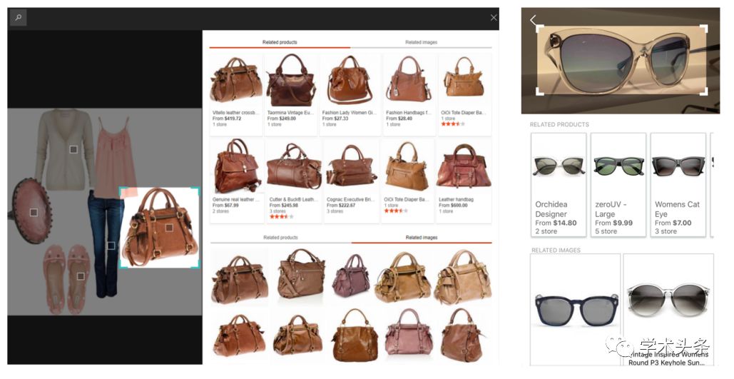 如下图所示,给定一个图片(左图是桌面版),系统可以自动检测图片中的重要元素,用户也可以根据自己的喜好选择图片中的对象,系统则自动找出和对象相关的产品;下图右边是一个手机版。