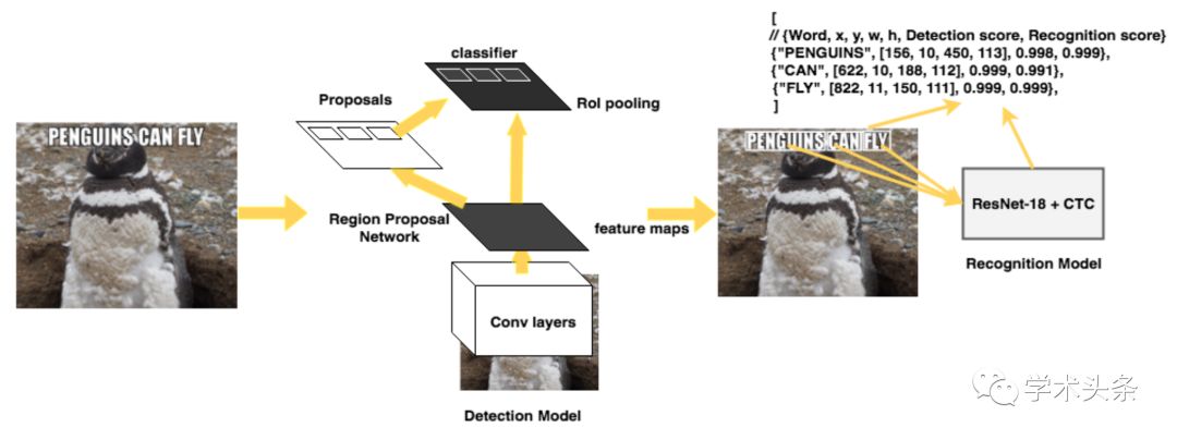 Facebook每天用户都上传大量图片,从这些图片中识别出文字可以帮助提高搜索和推荐效率。这里面的挑战主要是两个,一个是图片中的文字字体、文字语言多样,而且还可能有很多自定义词以及一些特殊的字符,例如网页链接等;另一个挑战是每天需要处理大量的图片。Rosetta的目标是做到实时处理(识别图片中的文字)用户上传的图片。从算法来说,Rosetta使用了一个两阶段的识别策略,第一阶段是用Faster-RCNN快速识别图片中包含文字的区域,第二阶段则是使用了一个全卷积网络进行文字识别。下图描述Rosetta的两阶段抽取架构。