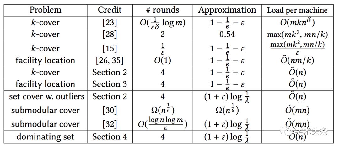 Submodular是数学、数据挖掘、优化等很多领域中的一个共性问题,早先几年在社交网络、尤其是影响力最大化传播中使用非常多,当然传统的数学问题就是Set Cover。Submodular比较流行是因为它虽然是一个NP难问题,但能找到一个非常简单的贪婪算法,并且能够保证很好的最优效果的近似(大约54-66%)效果。这篇文章是提出一个分布式算法,算法保证了很好的空间复杂度、优化效果。下图给出了不同submodular问题下文章方法和传统方法在理论上的比较结果,这是一个非常有意思而且很Solid的结果。其中Dominating Set就是影响力最大化的基础问题。